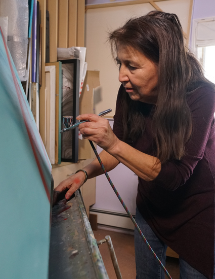 Wolastoqiyik artist, the late Arlene “Dozay” Christmas draws from oral tradition, history, and the land to bring Indigenous stories to canvas. Dozay aimed to bring traditional knowledge from museum storage rooms back to her community. From murals to fine art, she incorporates Wolastoqiyik petroglyphs, basketry, and landscapes to revive ancestral knowledge. Through research and collaboration with Wabanaki Elders, Dozay breathes life into Glooscap/Kluskap legends, ensuring that these stories remain vibrant for future generations.