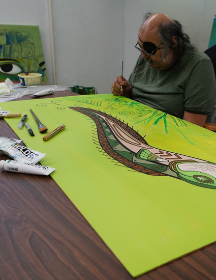 Mi’kmaq artist, musician, and storyteller Alan Syliboy brings ancient traditions to life through contemporary expression. Influenced by Mi’kmaq petroglyphs and spiritual teachings, his work explores themes of family, searching, and resilience. From CBC television productions to designing a Canadian Mint gold coin, Syliboy bridges cultures with his art, inviting audiences to see the world through an Indigenous lens.
